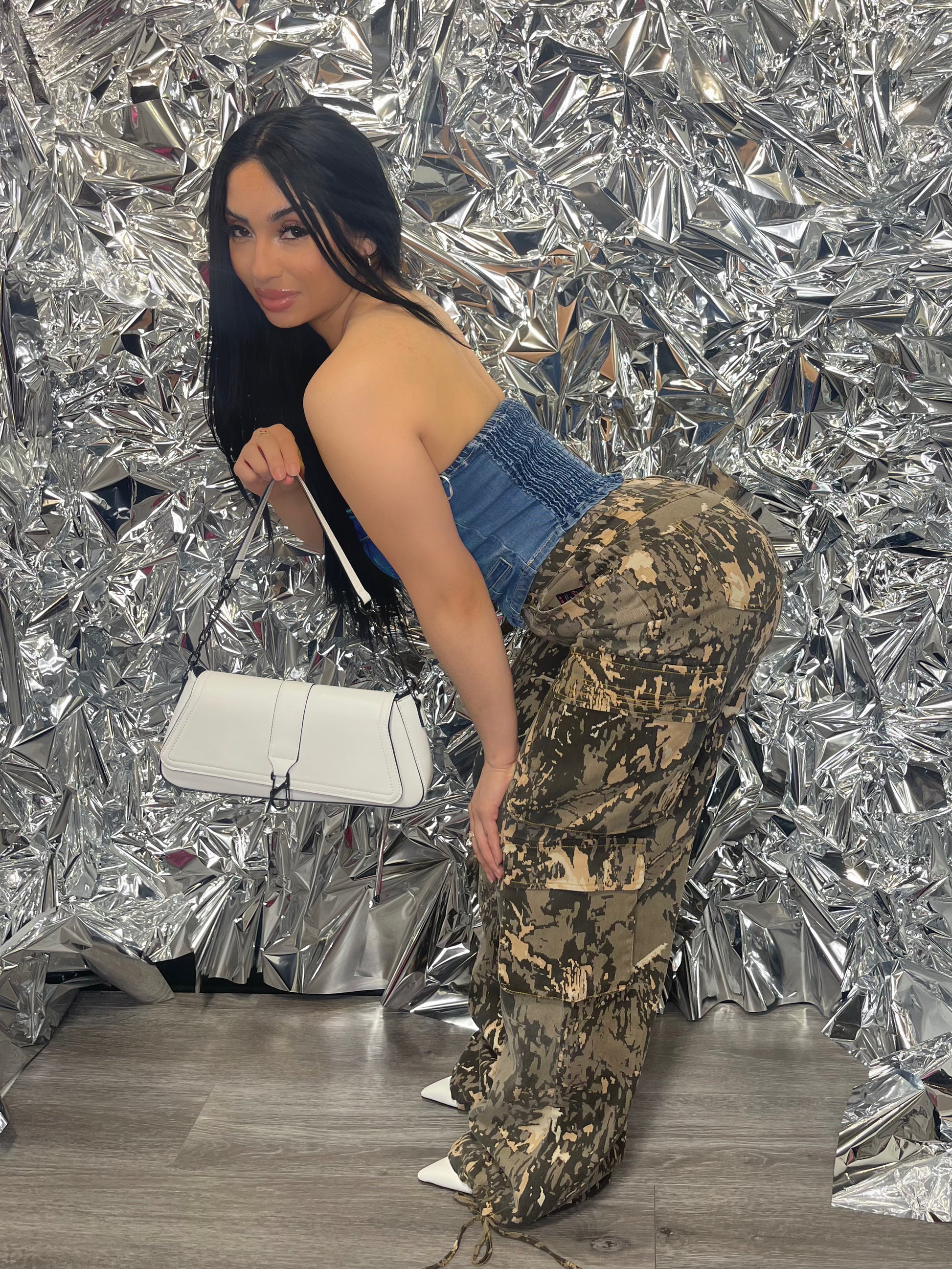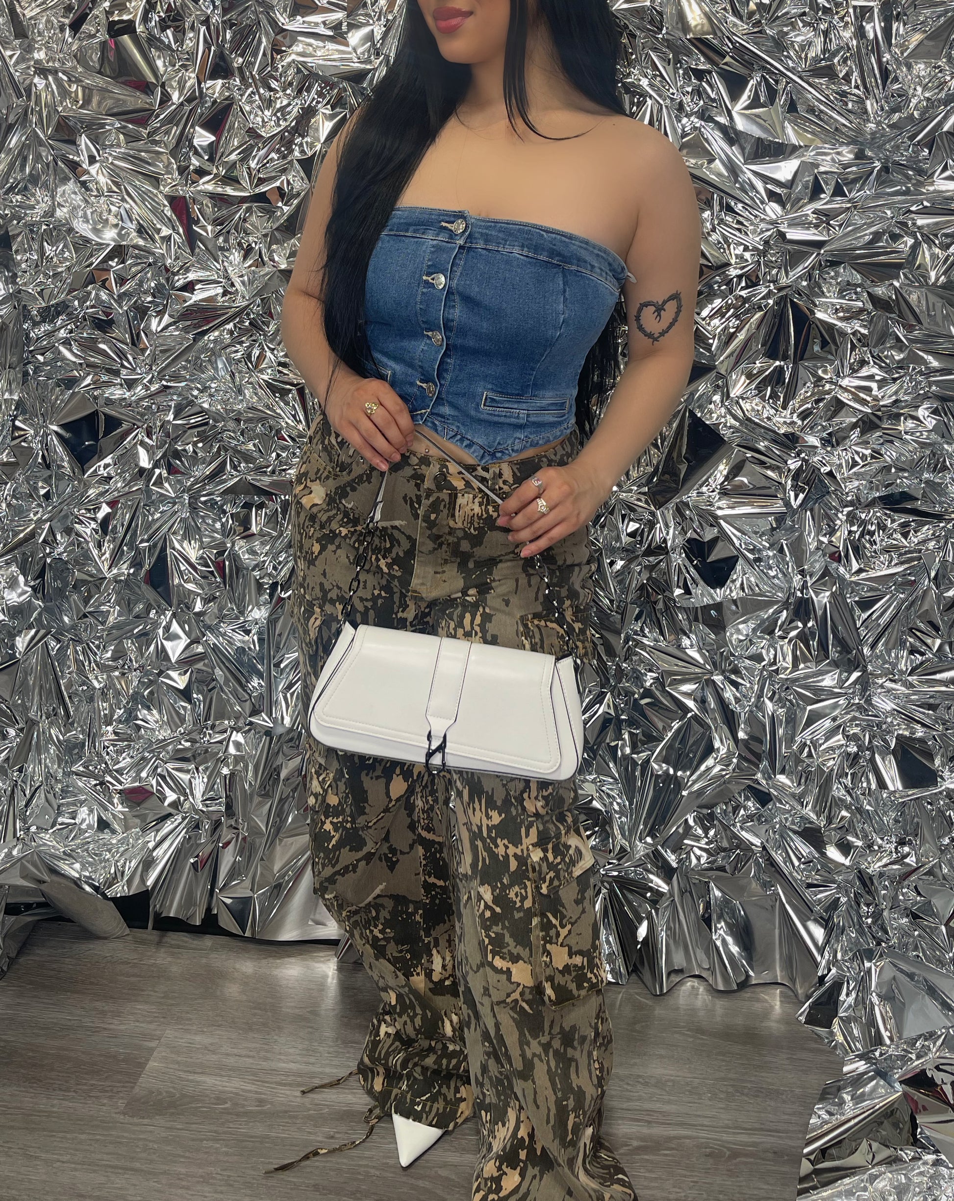 - Denim strapless button-up crop top