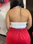 - Open back neck tie ribbed knit sweater. Perfect for your vacay!