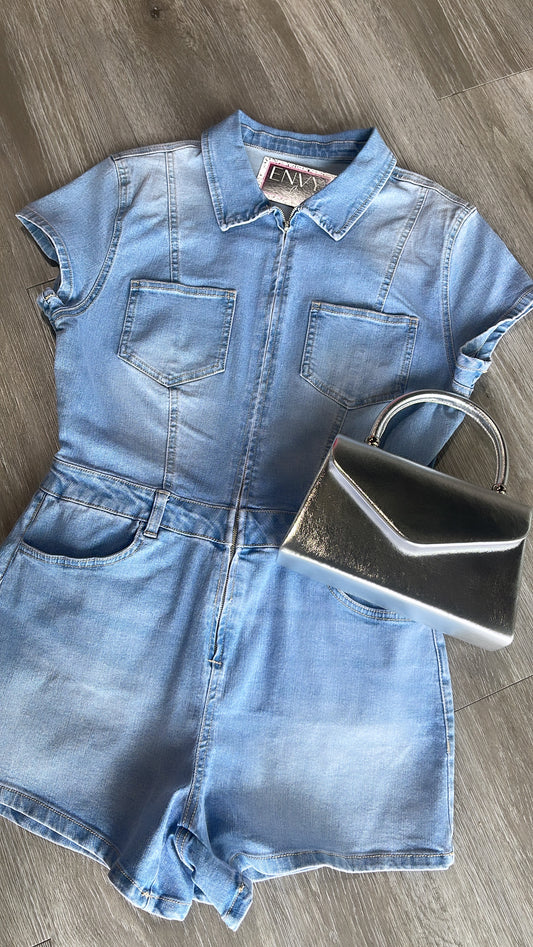 Denim romper with front zipper 72% Cotton 24% Polyester 3% Rayon 1% Spandex Color: LIGHT...