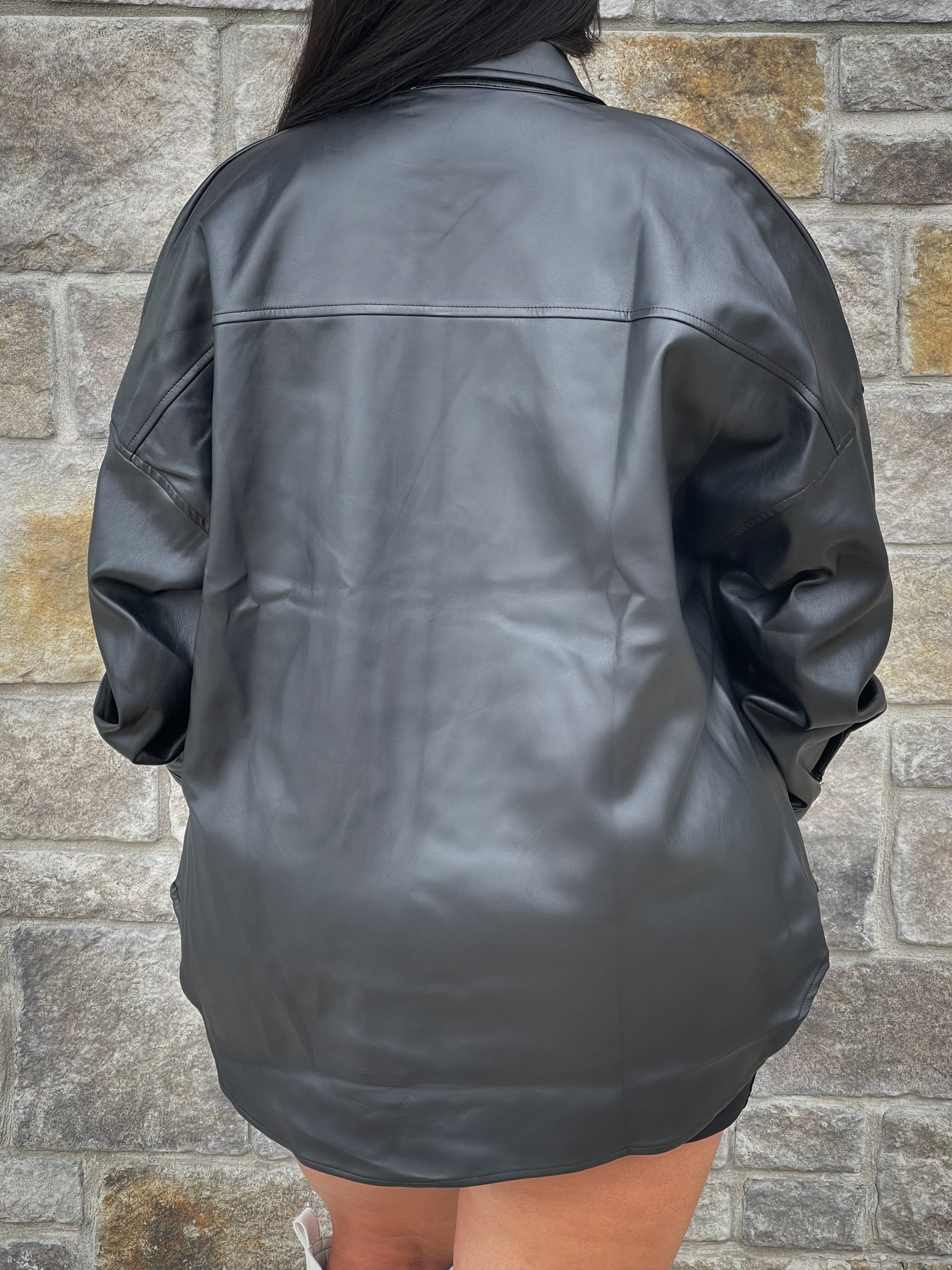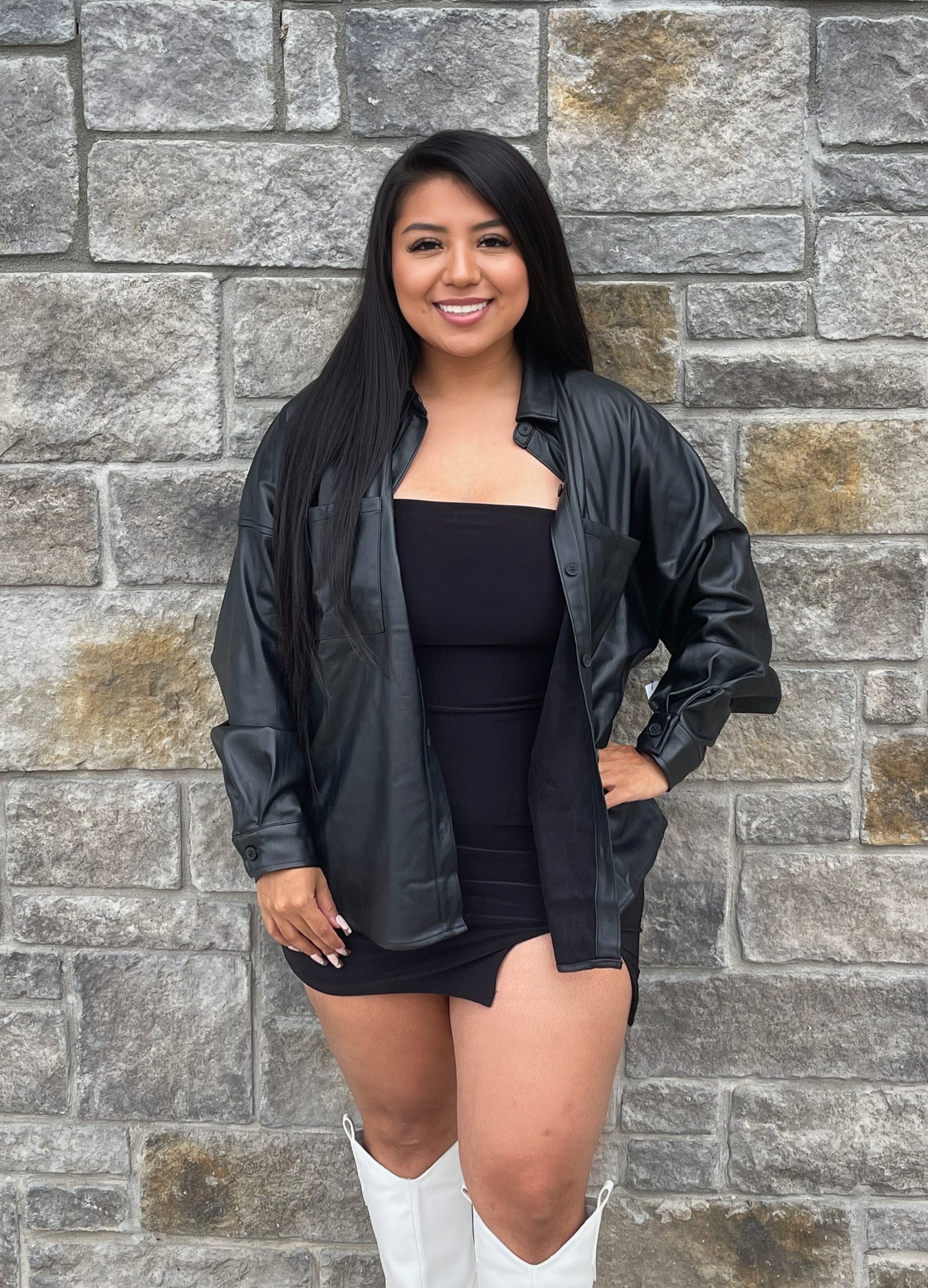 - Shacket is styled with a point collar, drop shoulders, relaxed long sleeves, and twin pockets at chest