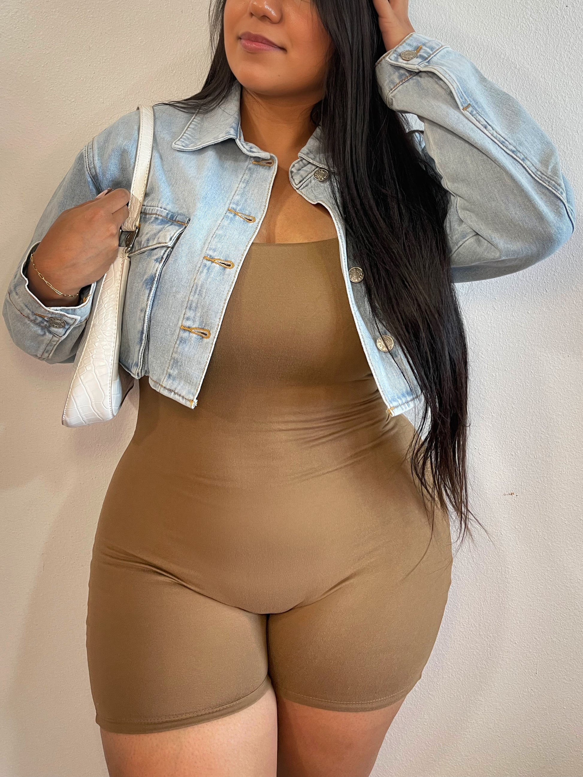 - Two pocket collared button up cropped denim jacket